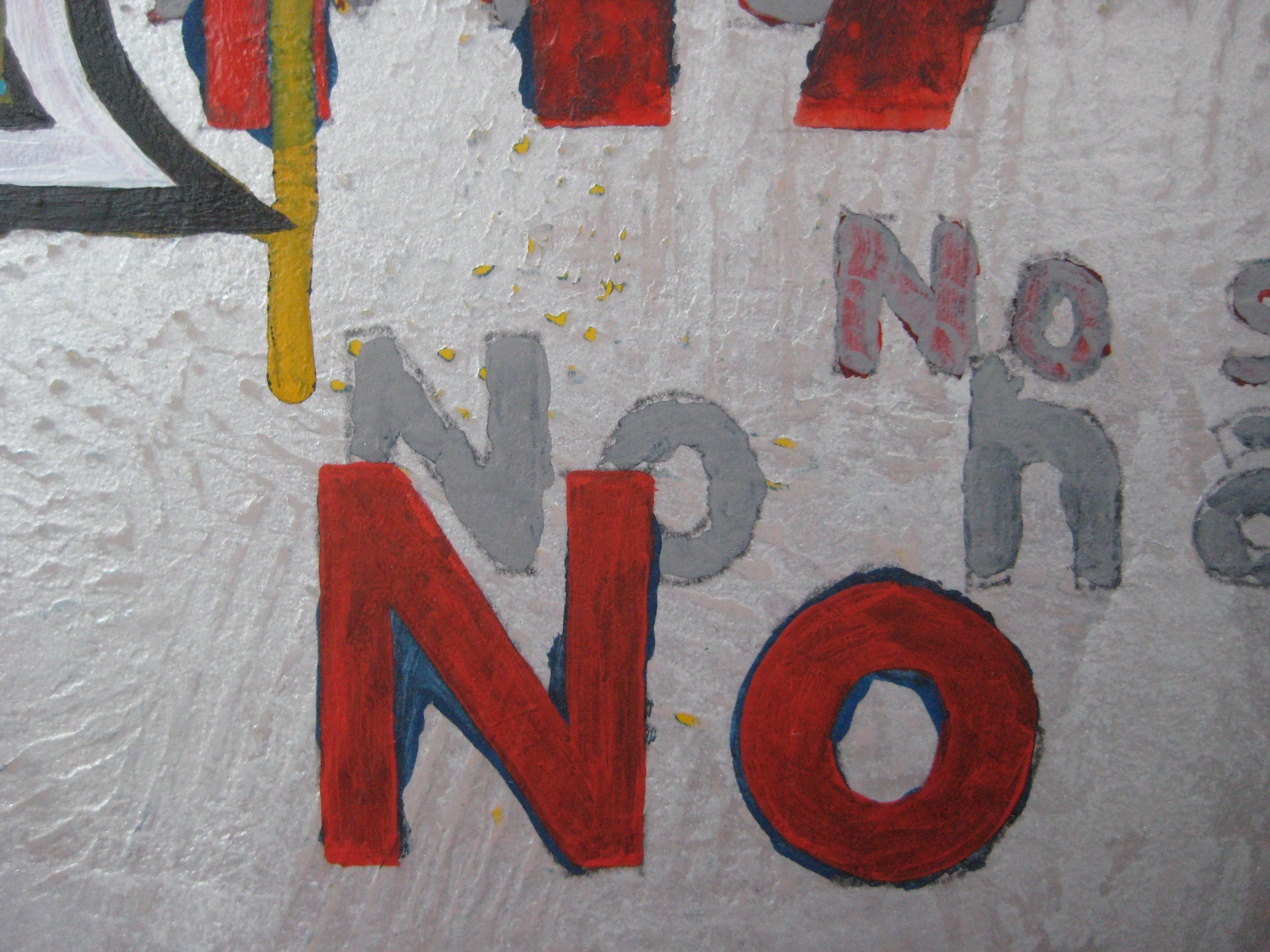 The underpainting for the text had almost as many layers as the swaths. The lack of an edge made the work seem unbound and too frantic, about to wobble off. Bringing an edge all the way around on top wouldn’t work, however because of the bottom of the painting which uses an old city sign program. I decided to terminate the edge in the “water” of the old sign logo, like a setting or rising sun.